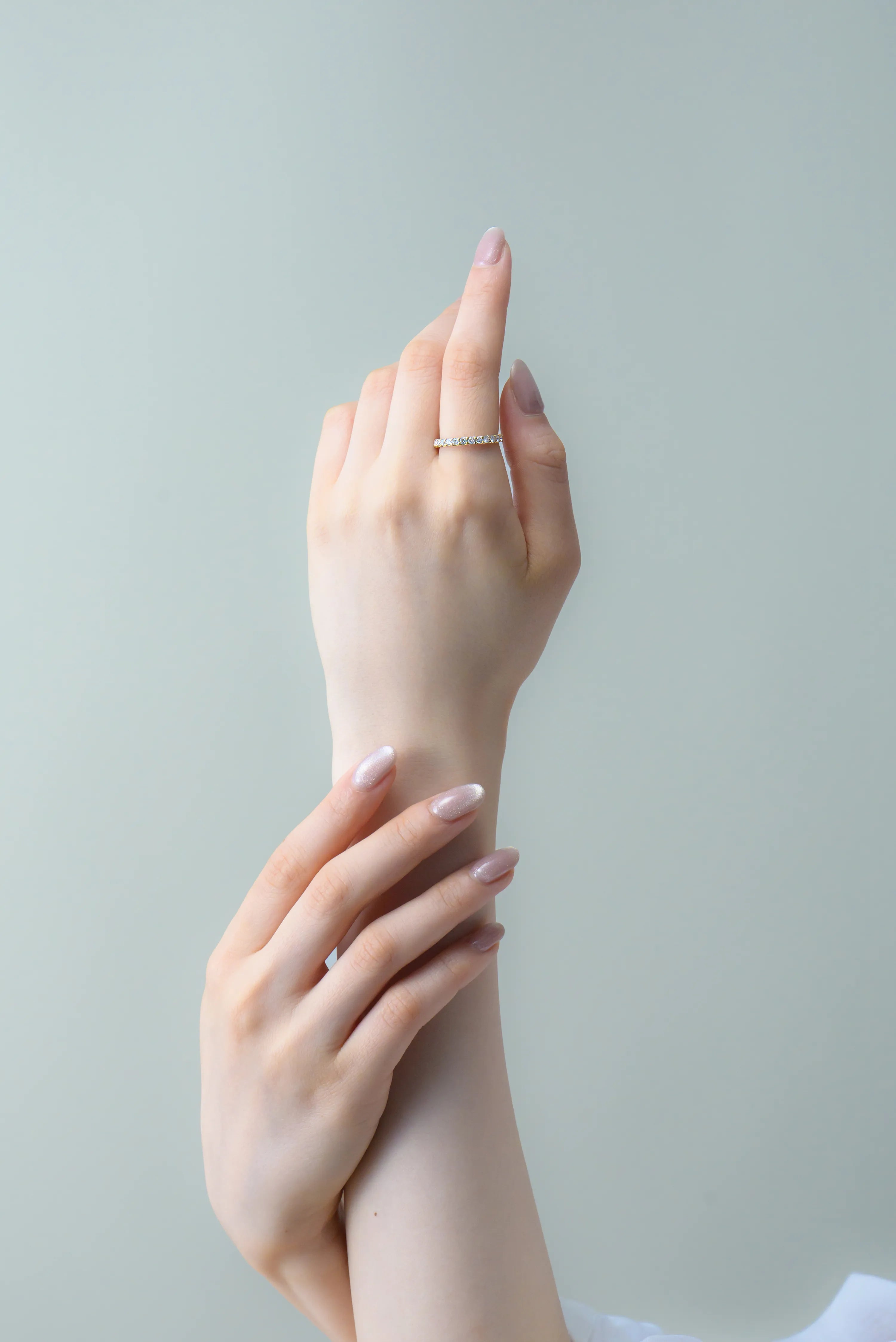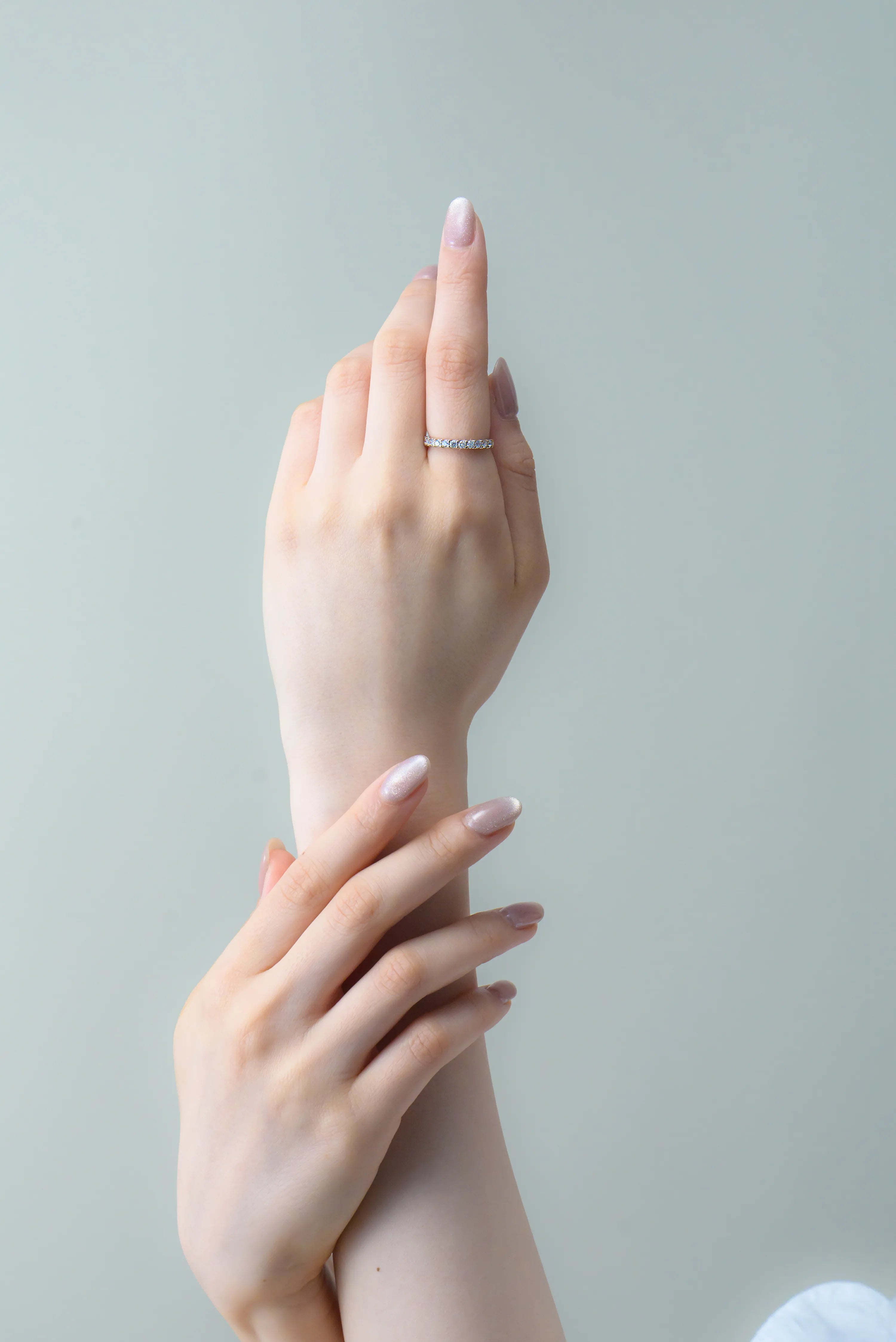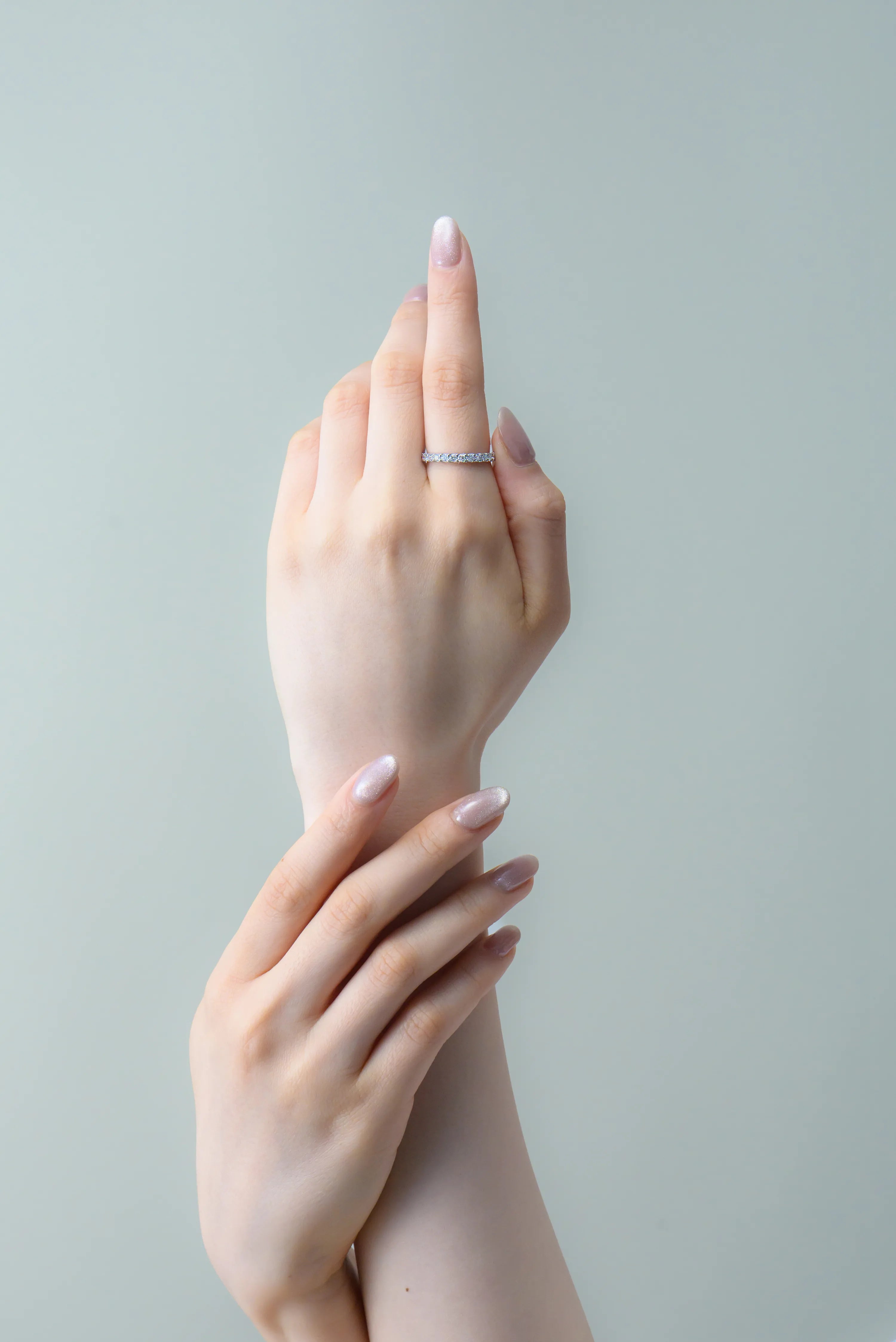 となり合う石を一緒に留めることにより爪の数をへらし、光を最大限にとり入れ放ちます。その輝きは、手元を見るたびに、あなたの気分を上げてくれるジュエリーになるでしょう。