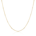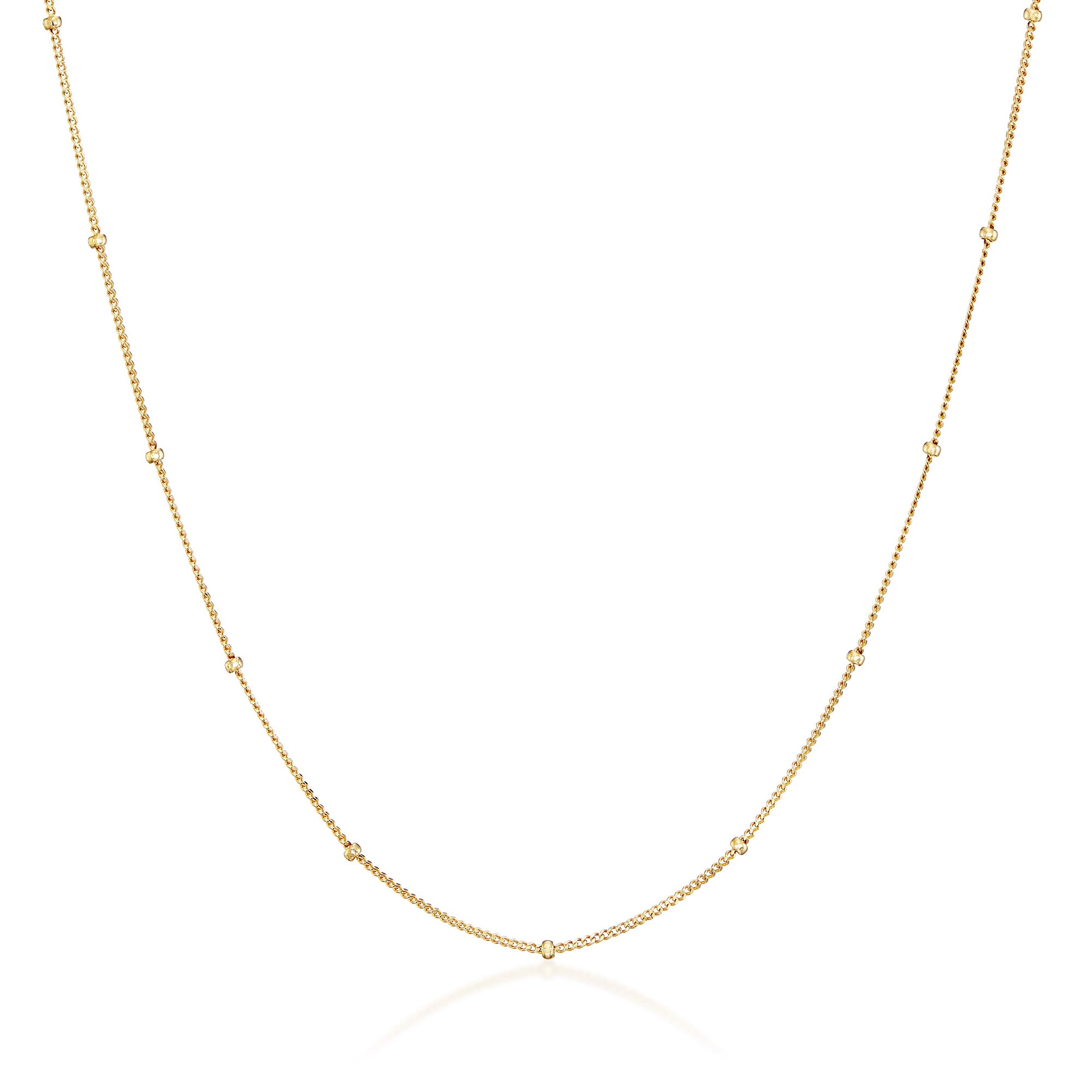 K18のボール一粒一粒が、胸元で輝きの軌跡を描き、身につけるたび華やかさを添えます。シンプルでありながら存在感があり、日常の装いにも特別なシーンにも上品な輝きを添えてくれる、永く愛されるデザインです。チェーン一本でもリュクスな印象をあたえます。