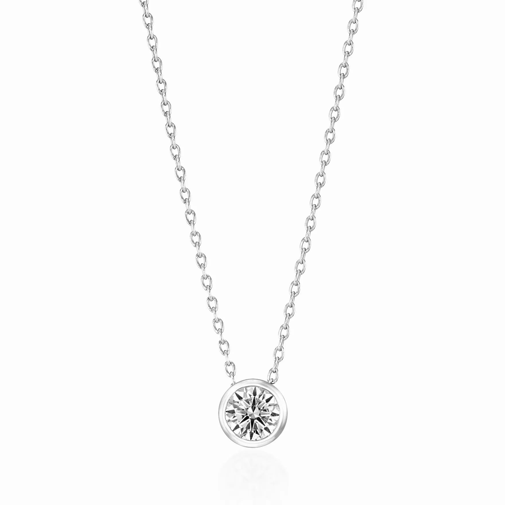 ラウンドブリリアントカット一粒で0.5カラットのベゼルセッティングのダイヤモンドネックレスです。プラチナ・K18で包むことでダイヤモンドを美しく大きく見せるデザインです。